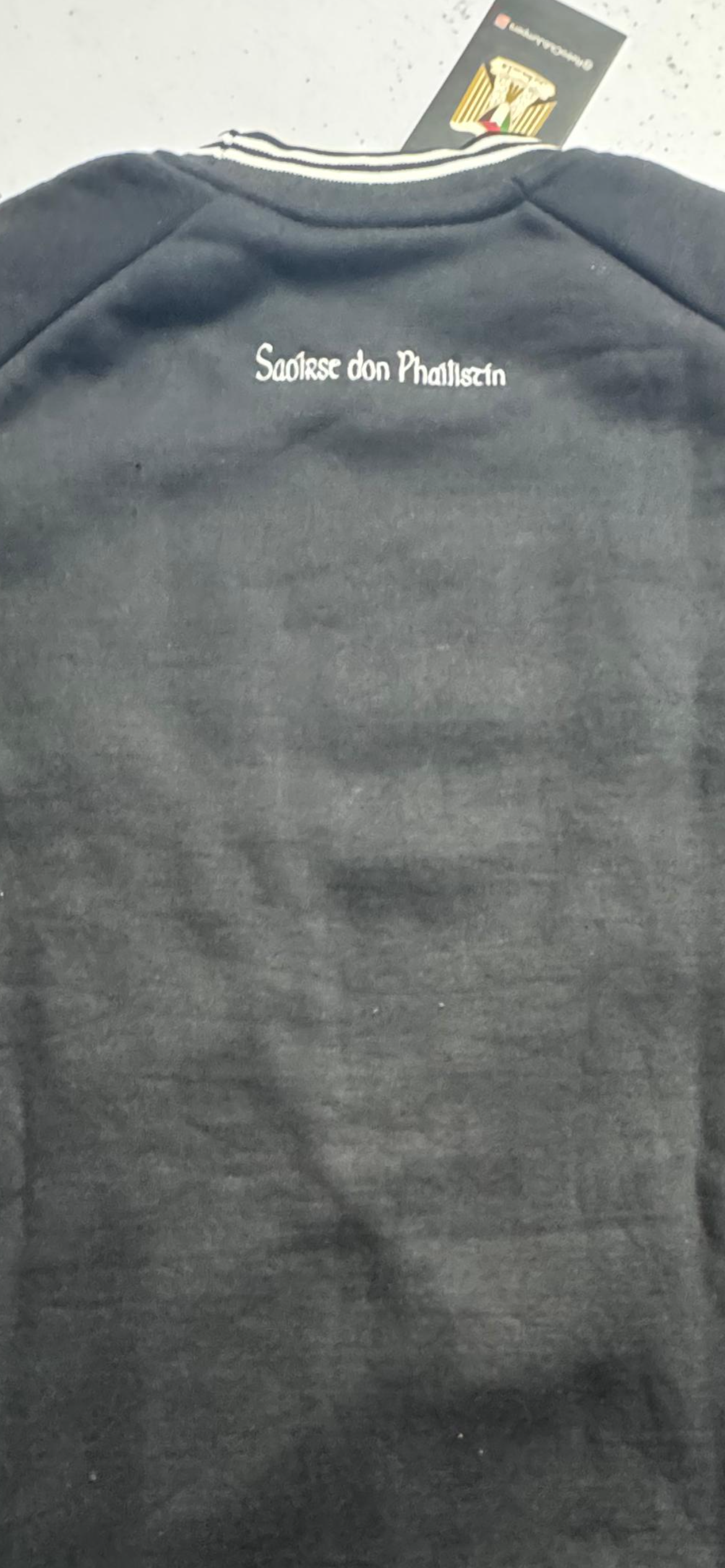 The design features a bold retro sportswear aesthetic with a minimalist front and the impactful phrase “Saor don Phalaistín” (“Free Palestine”) emblazoned proudly across the back in striking print.